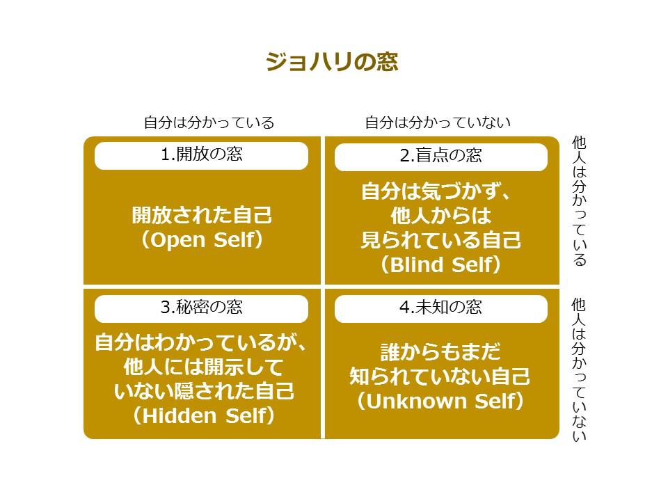 ジョハリの窓、参考にしてみてください。