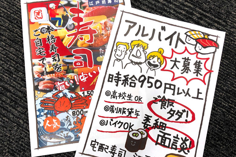 東京都世田谷区にある宅配すしのフランチャイズ店。宅配サービス業界では、メニューチラシを近隣家庭にポスティングするのは常識です。