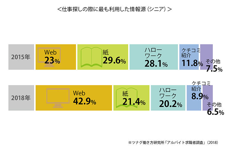 シニアのWeb媒体利用が増えています。ツナグ働き方研究所が実施したアルバイト求職者調査内・『仕事探しの際に最も利用した情報源』によると、Webで仕事を探すというシニア(60歳以上)の求職者は、3年前 の23.0%から42.9%と約20ポイント伸びています。代わりに、紙媒体・ハローワーク・クチコミ紹介といったリアルな方法はスコアを下げています。