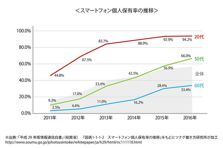 この背景には、スマートフォンの普及率があります。総務省『情報通信白書』によると2016年時点のスマートフォン普及率は50代が全体平均を上回り66.0%、60代が3年前(2013年)から3倍の33.4%と、シニア層の利用が大きく伸びています。