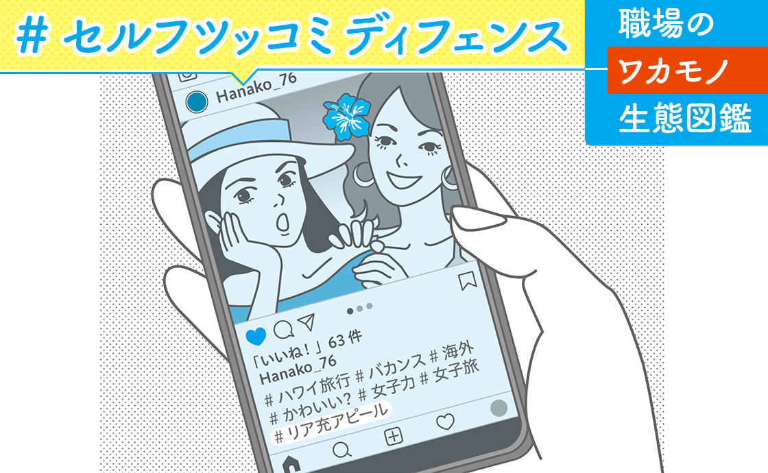 写真は『映える』旅先で撮られた女の子グループのキラキラしたセルフィ。いくつも並べられたハッシュタグの中には「♯リア充アピール」の文字。えっ? 自分でリア充って言っちゃうんだ……と一瞬たじろぎますが、これには理由があるのです。実は、友達から「うわ。リア充アピールしてるよ」と言われないように、先回りして予防線を張っているんです。
