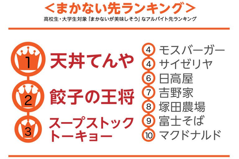 今回の調査における「まかないが美味しそうなアルバイト先」1位は天丼てんや。2位は餃子の王将、3位はスープストックトーキョーで、まったく異なる料理ジャンルの3店がトップ3という結果になりました。モスバーガーとサイゼリヤが同率4位になっています。
