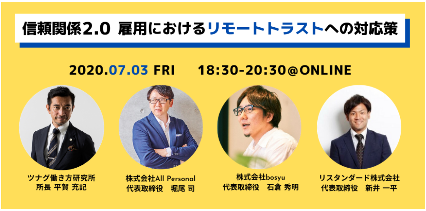 オフィスで実際に顔を合わせて仕事や採用面談をしても信頼し合うことが難しい中、アフターコロナでは、信頼構築はどのように変わっていくのか、新たな働き方の第一線を担うゲストと共に、一歩先を行く雇用・採用の信頼構築について考えるセミナーです。