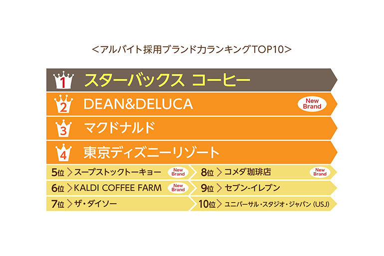 今回の調査で最も採用ブランド力が高いと評価されたのは、スターバックス コーヒーという結果になりました。2位は僅差でDEAN&DELUCAが獲得。次いで3位にマクドナルド・4位東京ディズニーリゾート・5位スープストックトーキョーがランクインしました。