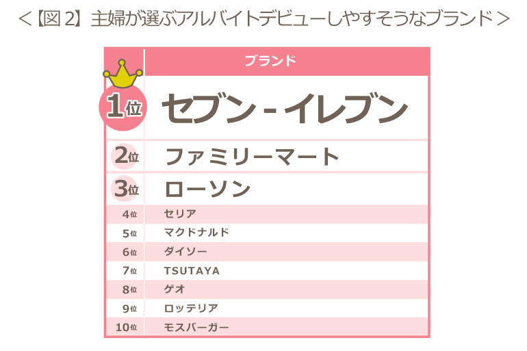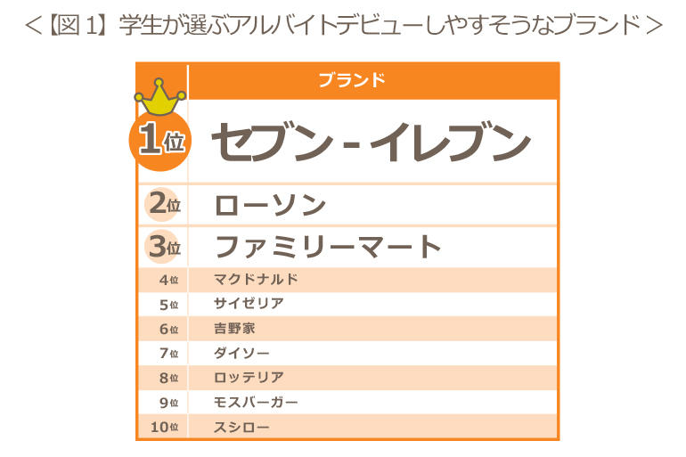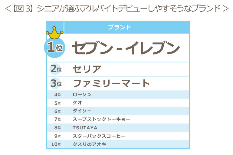 『アルバイトデビューしやすそう』と思うブランドについて聴取したところ、1位は学生・主婦・シニアともに、セブン-イレブンが1位を獲得【図1】【図2】【図3】。