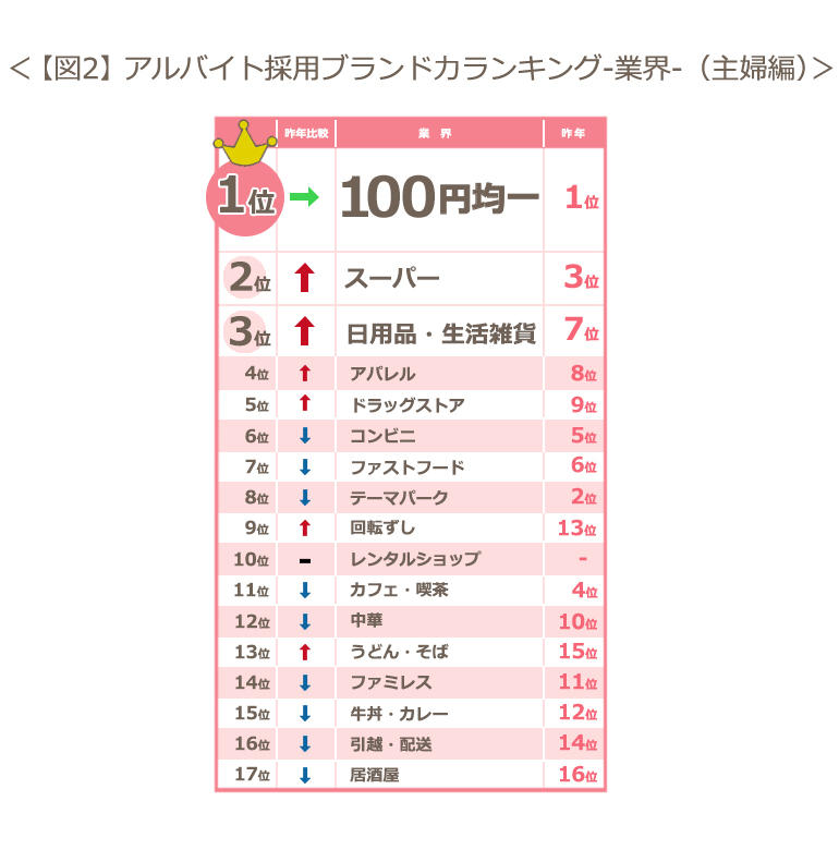 - アルバイトブランド力・業界別第1位は昨年同様、100円均一