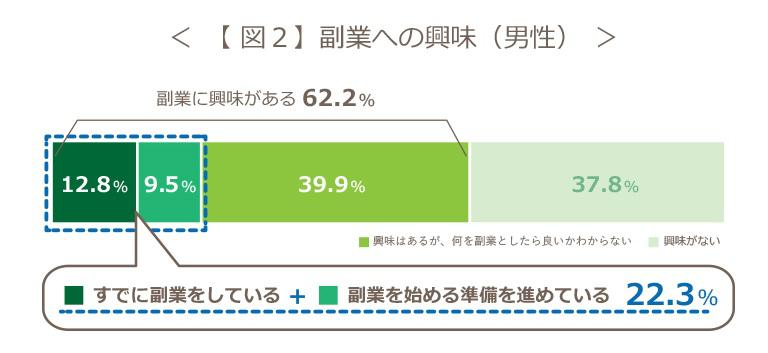 男性は62.2%が「副業をしている・興味がある」。その中で、「すでに副業をしている」「準備を進めている」人は22.3%【図2】。