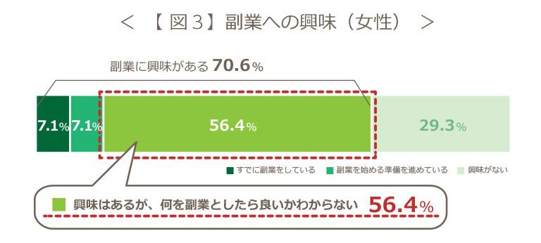 3.女性は70.6%が「副業をしている・興味がある」。「何を副業としたら良いかわからない」は56.4%
