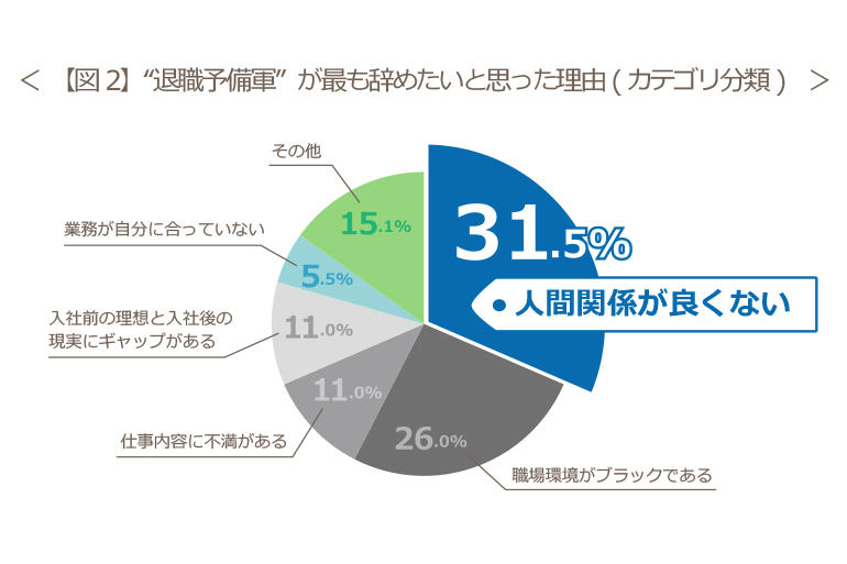 『退職予備軍』の彼ら彼女らが「最も辞めたいと思った理由」をカテゴリ別に集計すると、上司や同僚などとの「人間関係がよくない」が31.5%でトップ。次いで「職場環境がブラックである」26.0%、「仕事内容に不満がある」11.0%、「入社前の理想と入社後の現実にギャップがある」11.0%と続いている【図2】。