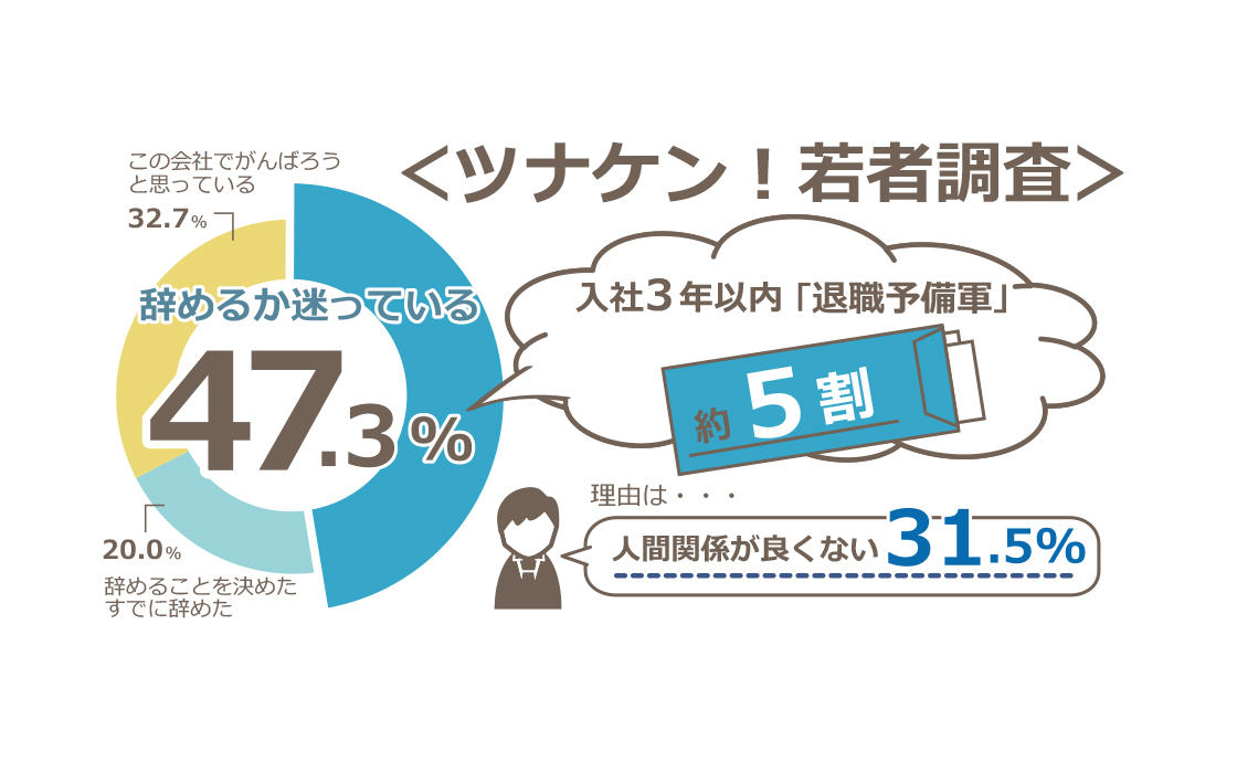 すでに「辞めたいと思っている」人たちと比べ、「辞めるかどうか迷っている」、『退職予備軍』の若者たちは、所属している企業に退職意向を示すどころか、まだその素振りさえも見せていない可能性もある。また、職場内がそのような状態であれば、入社3年目以内の若者に限らず、それ以上の年次の社員にとっての不満につながっている可能性も考えられる。