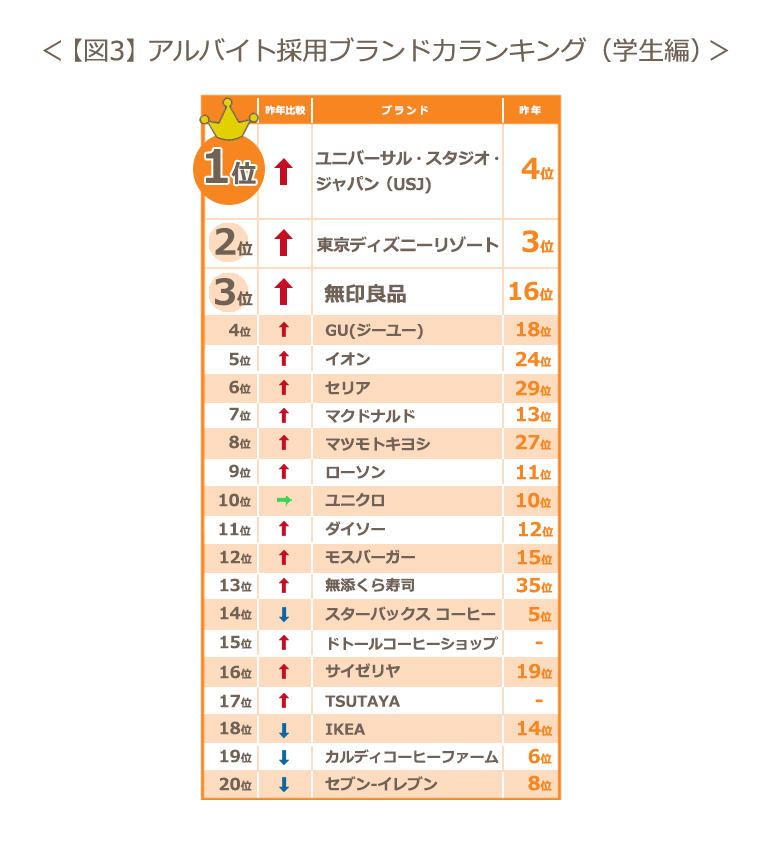 ブランド別では業界別の傾向を反映し、1位がユニバーサル・スタジオ・ジャパン(昨年4位)、2位が東京ディズニーリゾート(昨年3位)。2社は昨年から順位が逆転し、ユニバーサル・スタジオ・ジャパンが初の1位という結果になった【図3】。フリーコメントでは、どちらも「楽しそうだから」「一度は経験してみたい」「教育がしっかりしている印象。学べることが多そう」という声のほか、ユニバーサル・スタジオ・ジャパンについては「ユニバ(ユニバーサル・スタジオ・ジャパン)が好きで世界観等も楽しめるから」という声が聞かれた。映像技術を活用したアトラクションや、季節ごとのイベントなどの話題作りが、集客だけではなく、アルバイト先としても功を奏していると言えそうである。