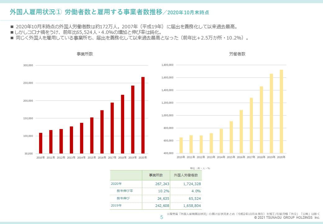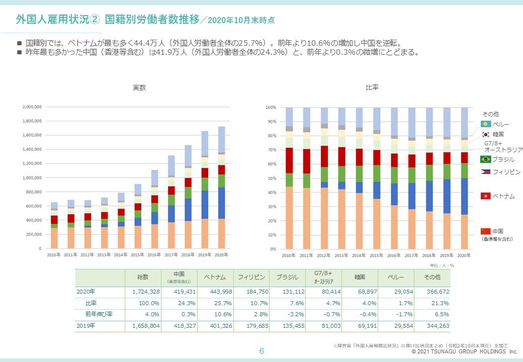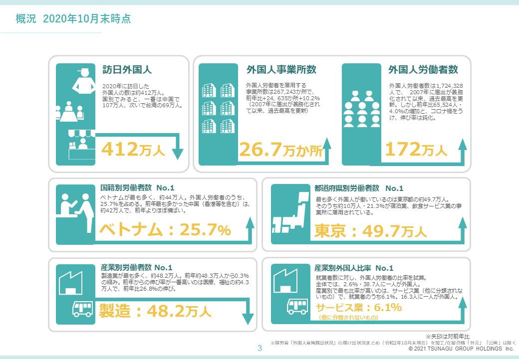 ■ 2020年10月末時点の外国人労働者数は約172万人。2007年(平成19年)に届出を義務化して以来過去最高。