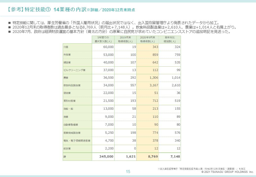 P15~17:2020年12月末に出入国在留管理庁から発表された「特定技能在留外国人数」(令和2年12月末現在:速報値)をもとに、特定技能在留外国人数に関するデータをまとめました。